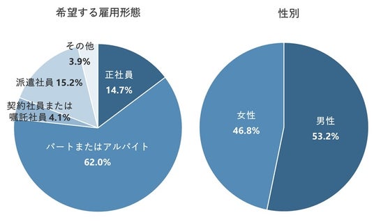 一方、「女性」のほうが「男性」よりも「交通費が全額支給されるから」が11.4pt、「賃金が高いから」が11.3pt、「会社の知名度が高いから」が9.9pt高くなった。収入面を重視して仕事探しを進めている傾向がうかがえる。