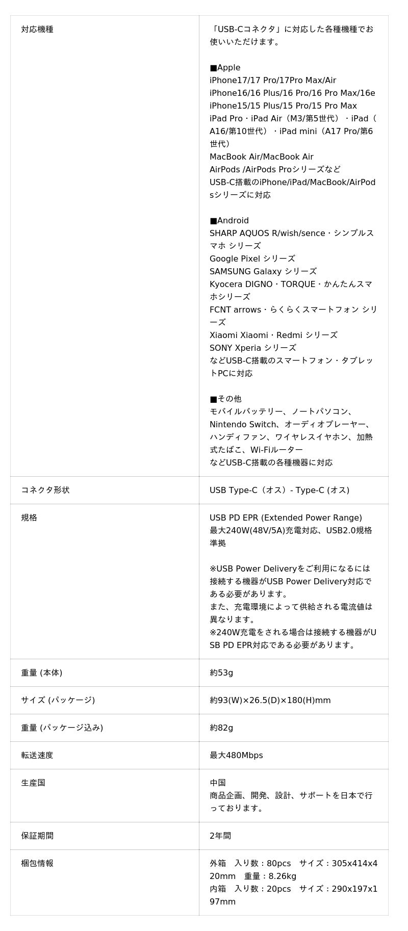 マグネットの力でケーブルがくっつき、自然とまとまるのが魅力のケーブルです。PD240W急速充電に対応なのであらゆるデバイスをスピーディに充電してくれます。