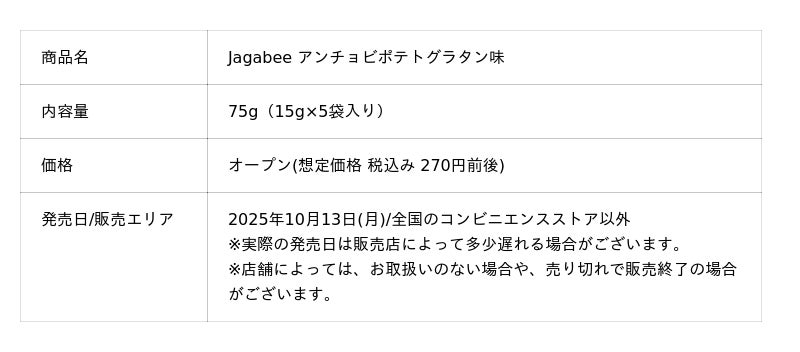 カルビー株式会社(本社:東京都千代田区、代表取締役社長兼CEO:江原 信)は環境配慮の取り組みや自然を楽しむ企画を展開する「Jagabee Happee3プロジェクト」の1つである「Green Project」の第4弾を実施いたします。2025年は、「ムーミン」作品にゆかりの深い北欧の伝統的な家庭料理の味を再現した『Jagabeeアンチョビポテトグラタン味』をコンビニエンスストア以外の店舗で2025年10月13日(月)から数量限定発売します。定番の『うすしお味』も新しいコラボレーションパッケージで発売しています。※いずれも無くなり次第終了。