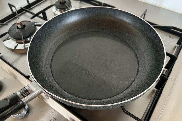 まずは、フライパンに水を1cm弱入れて、蒸気が出るまで待ちます。