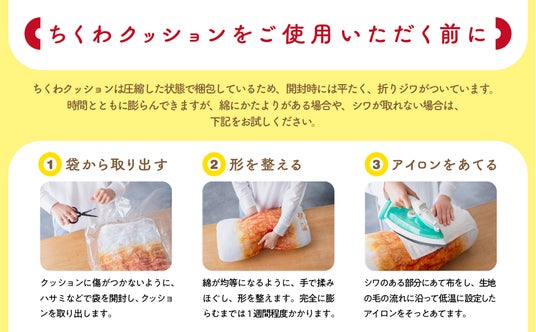 ちくわクッションは圧縮した状態で梱包しているため、開封時には平たく、折りジワがついています。届きましたら開封し、綿が均等になるように手で揉みほぐしてください。完全に膨らむまでは1週間程度かかります。