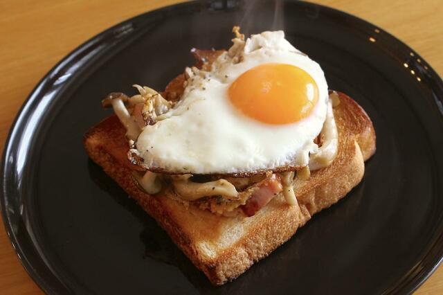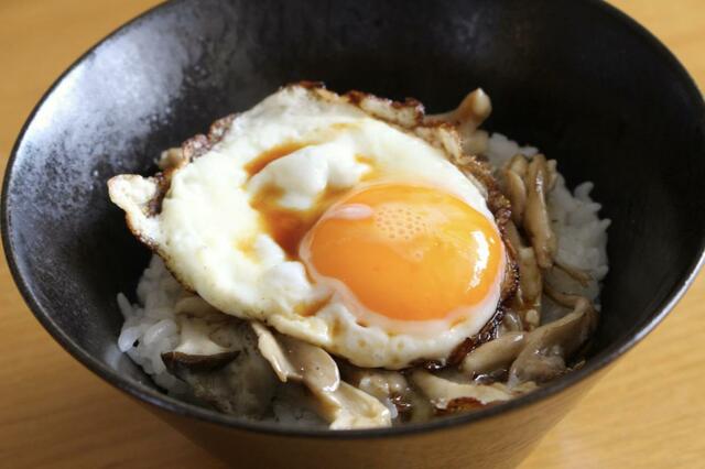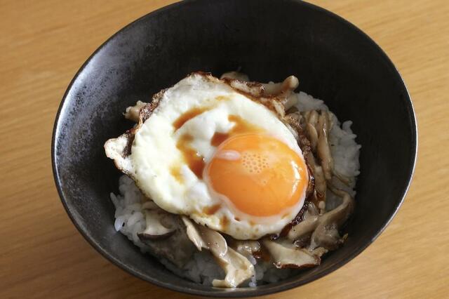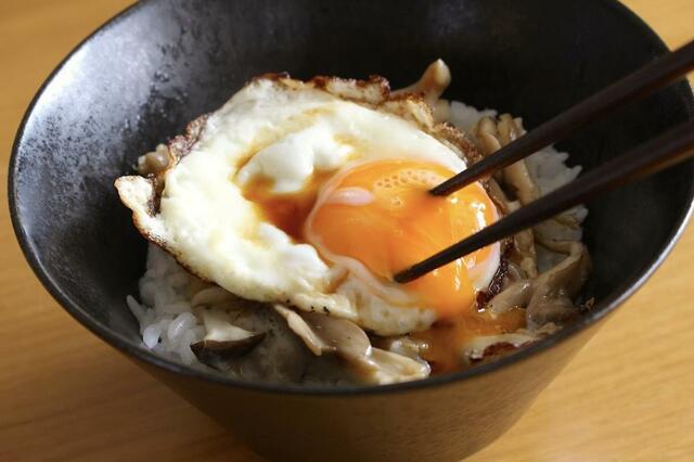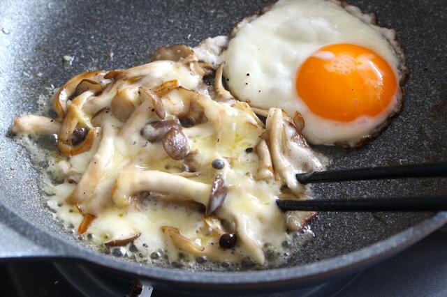 目玉焼きの黄身を割ってごはんと混ぜながら食べれば、バターとキノコの風味とチーズのコクが効いた、香ばしい卵かけごはんみたいな雰囲気に。