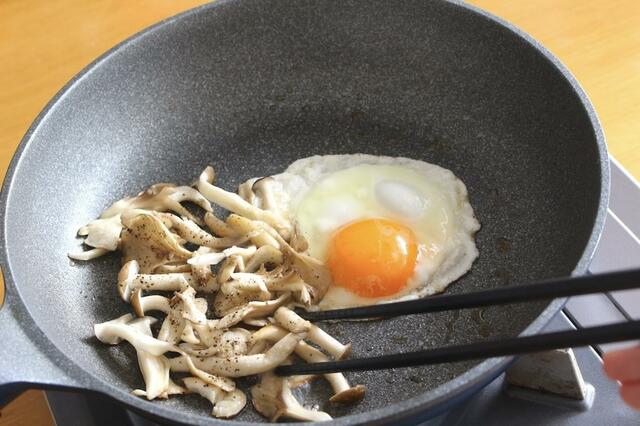2. 熱したフライパンにバターを落とし、キノコを入れて塩コショウして加熱。その隣に卵を割り入れて目玉焼きを作る。