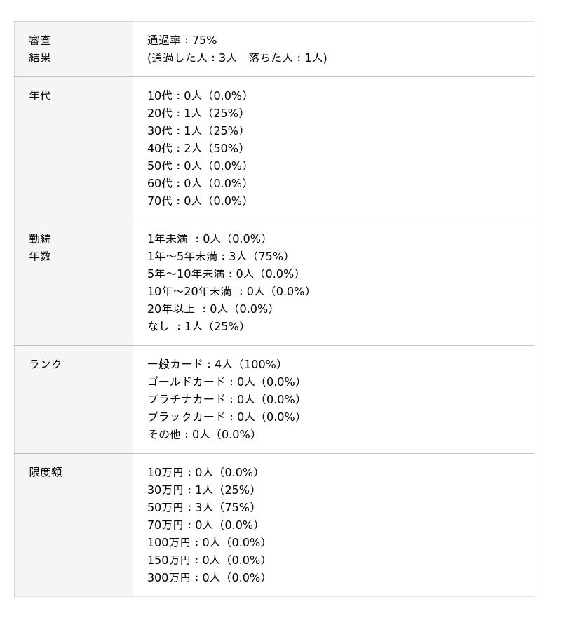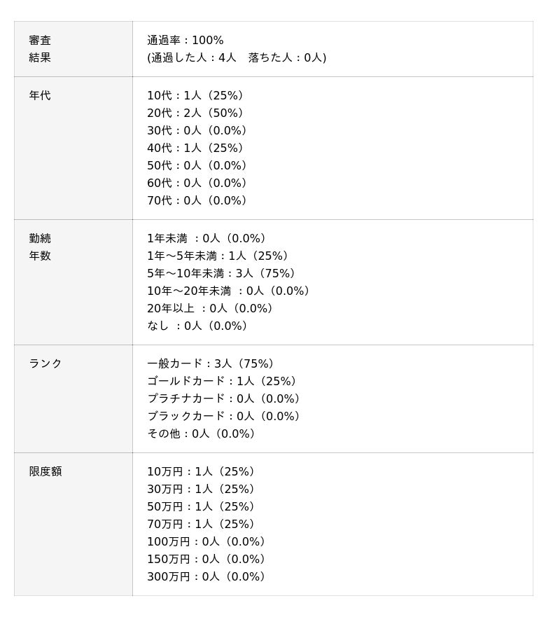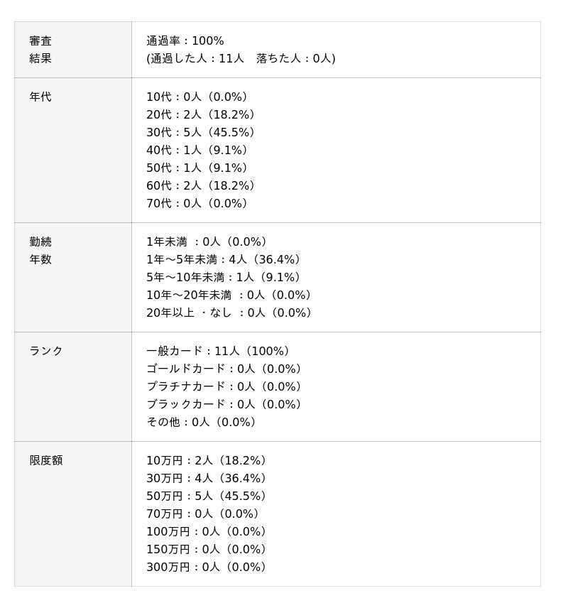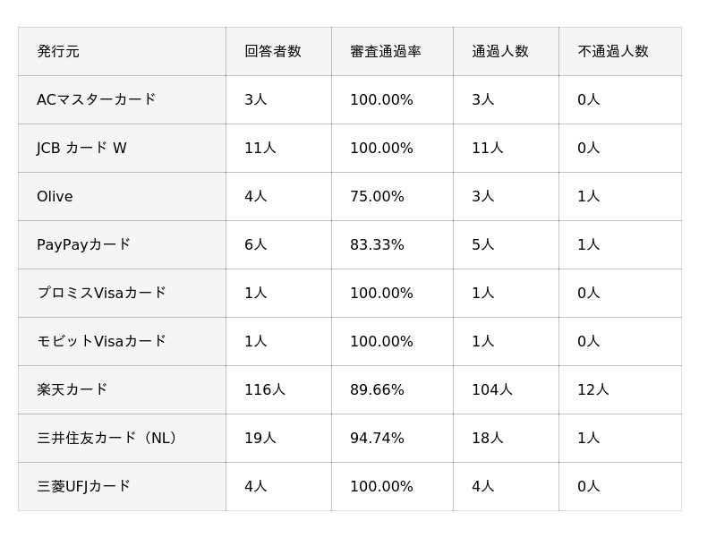 ※審査通過率は「通過人数 ÷ 回答者数」をもとに小数第1位まで算出しています。回答は自己申告に基づくものであり、各カード会社の公式データとは異なります。