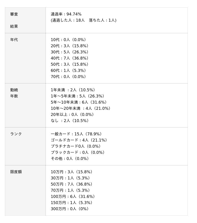 ACマスターカードの審査通過率は100%でした。審査に通過した方は勤続年数が1年以上で一般カードを選択している傾向がありました。
