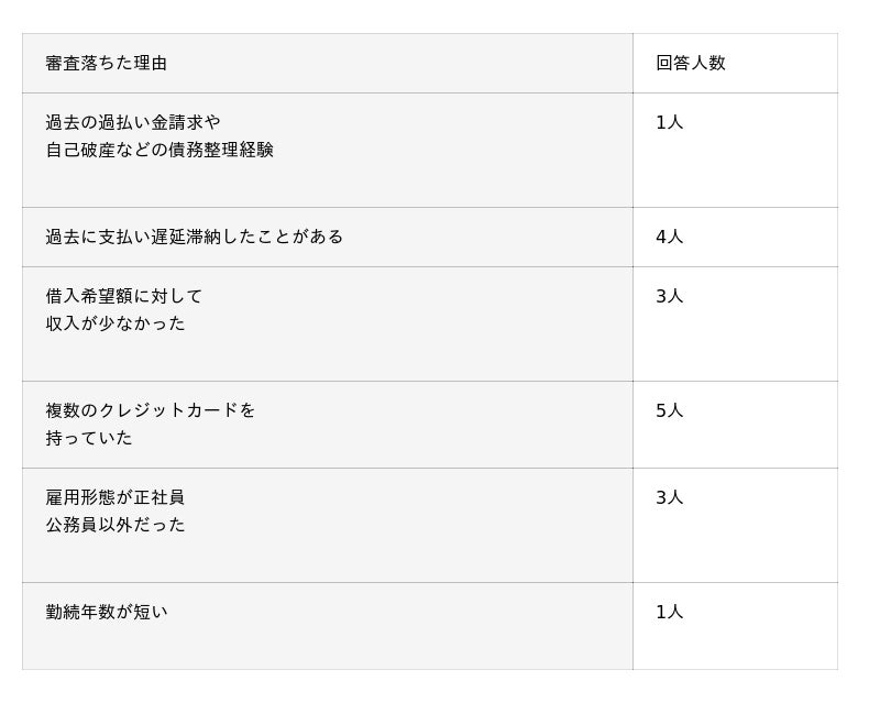 本調査では200人中17人の方が審査に通らなかったと解答しています。審査に落ちたことがある方の回答を下表に一覧で紹介します。