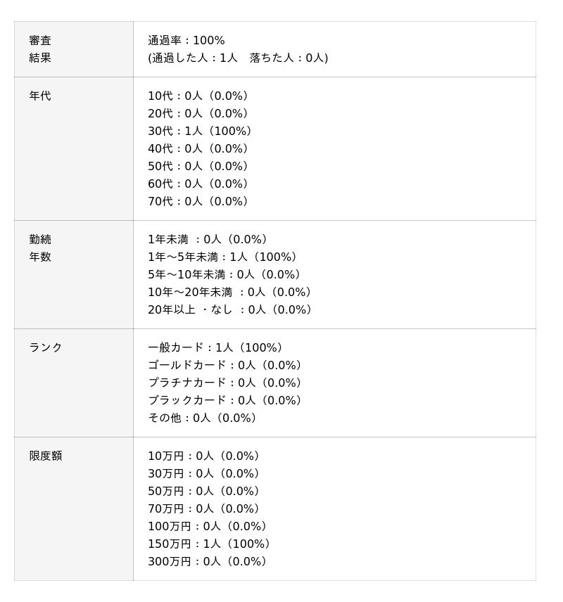 プロミスVisaカードの審査通過率は100%でした。審査に通過した方は勤続年数が1~5年以内で他社と差分はありませんが他社と比較して限度額が150万円と高い傾向がありました。