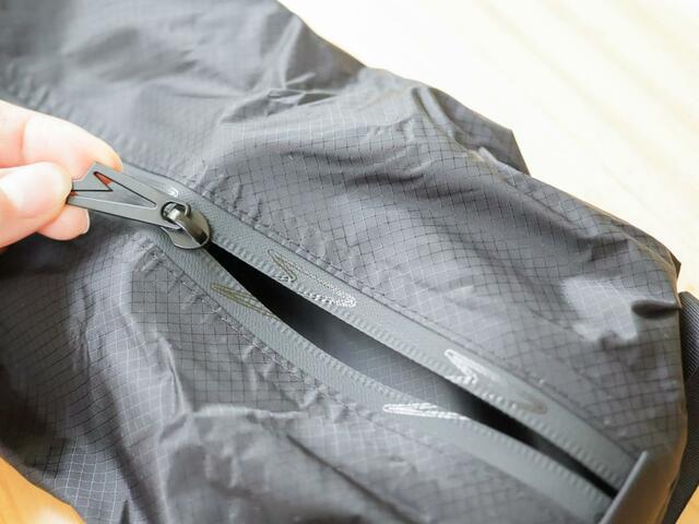 はっ水加工のナイロン素材、ジップ部分には止水シームテープが施されているなど、さすがスイムウェアブランドのバッグ……!