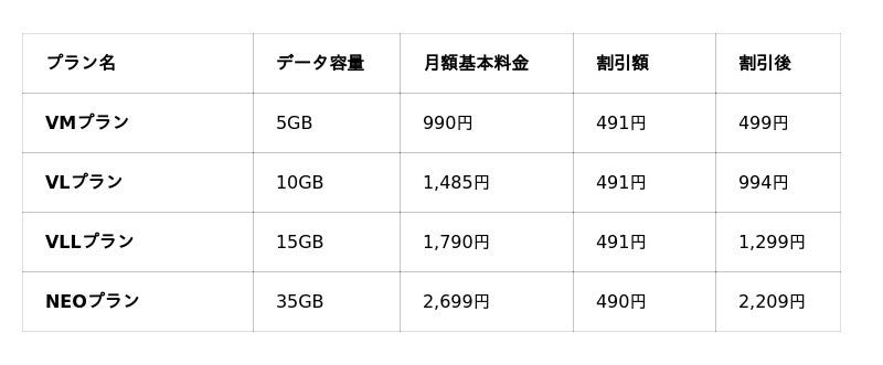 - 対象プラン:VMプラン(5GB)、VLプラン(10GB)、VLLプラン(15GB)、NEOプラン(35GB) ※すべて音声通話付きSIMのみが対象