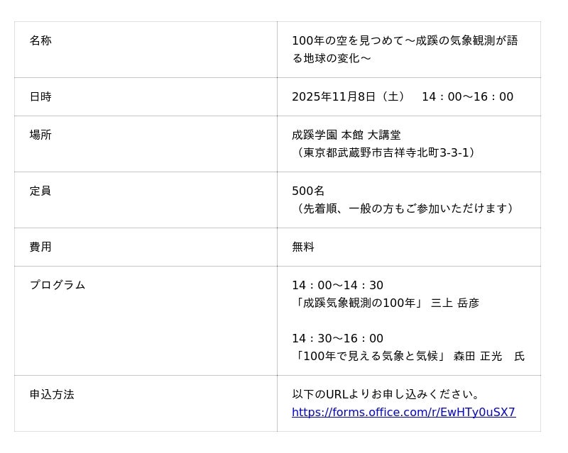 成蹊学園(東京都武蔵野市、学園長:江川雅子)では、成蹊気象観測100周年記念講演会を開催します。