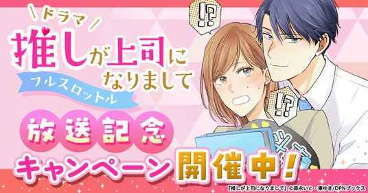 DPNブックスの人気作品『推しが上司になりまして』(漫画:森永いと、原作:東ゆき)の実写ドラマ「推しが上司になりまして フルスロットル」の放送を記念し、各電子書店での無料話増量キャンペーン、なにとぞ編集部公式Xでのプレゼントキャンペーンなど様々なキャンペーンを開催中です!