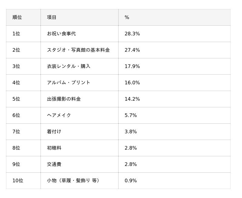 「お祝い食事代」(28.3%)と「スタジオ・写真館の基本料金」(27.4%)が僅差で上位となり、いずれも約3割の親が値上がりを実感。七五三の「主役」である衣装(17.9%)を大きく上回る結果となりました。