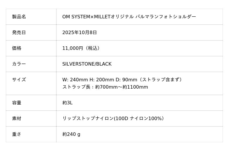 OMデジタルソリューションズ株式会社(代表取締役社長 兼 CEO:杉本 繁実)が展開する映像製品ブランド「OM SYSTEM」は、フランスを代表するアルパインブランド 「ミレー」(ミレー・マウンテン・グループ・ジャパン:東京都品川区、代表取締役:ペア・ラスムセン)との共同開発による新製品「OM SYSTEM×MILLETオリジナル パルマランフォトショルダー」 を公式オンラインストア「OM SYSTEM STORE」と「楽天市場 OM SYSTEM 公式ストア」、さらにギャラリー併設型ショールーム「OM SYSTEM PLAZA」にて2025年10月8日より販売します。