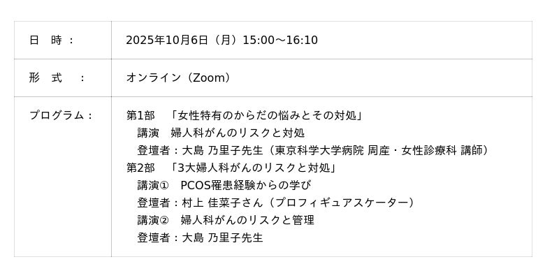 本イベントは、婦人科腫瘍学・女性医学の専門医である大島 乃里子先生(東京科学大学病院 周産・女性診療科 講師)とプロフィギュアスケーターの村上 佳菜子さんによる楽しいトークを通じ、婦人科がんの早期発見・早期治療開始のためにも、普段は後回しにしがちな“自分の体と心”について向き合うことの大切さを多くの女性に気づいていただくきっかけとして開催されました。仕事や家事、育児等に追われる日々でも、ちょっとした体のサインを見逃さないために注意していただきたいポイント等、本イベントで話された内容についてご紹介します。