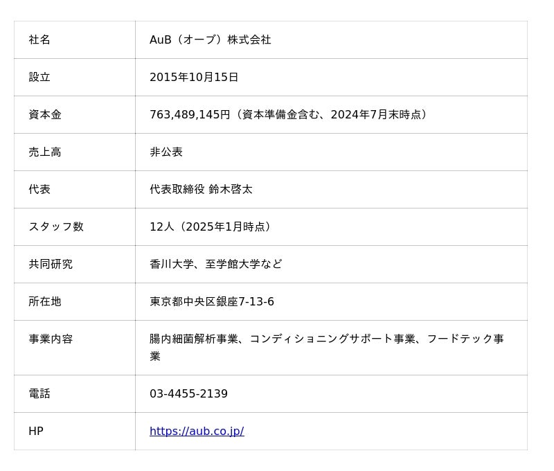 AuBは、2015年10月に創業した、アスリートの腸内細菌を研究する企業です。代表取締役の鈴木啓太は、サッカーJリーグのチーム「浦和レッドダイヤモンズ」のプロ選手(2000.1-2016.1)で、日本代表(A代表)でも活躍した元トップアスリートです。