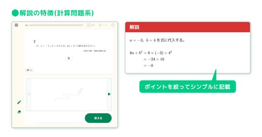 また、6月にリリースした「高校入試の過去問題」では、高校入試の実戦演習を想定し、先生による指定配信に限定したコンテンツ仕様になっておりますが、新コンテンツ「高校入試の練習問題」では、先生による指定配信だけでなく、子どもたちの学習画面から子どもたち自身が問題を選んで取り組むことが可能です。さらに、問題ごとにわかりやすい解説を搭載し、子どもたちによる自律的な力試しの機会として活用いただけます。