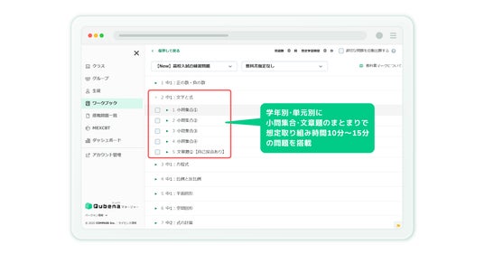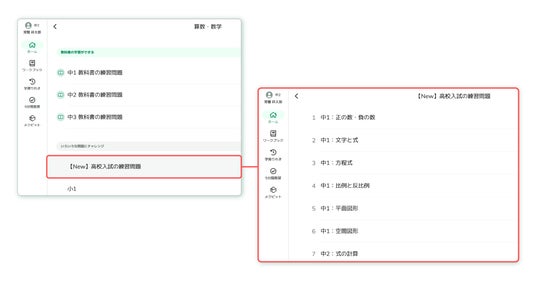 - - 「ワークブック」機能で先生が問題を指定して配信するほか、子どもたちの学習画面の目次から「高校入試の練習問題」に取り組むことができます。教科書の問題を解き終えた後の力試しなど、さらに問題を解きたいという子どもたちの意欲に応えます。