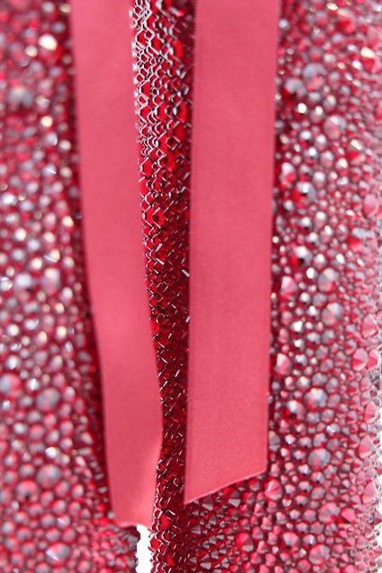 一足のバレエシューズ。正面に、側面に、余すところなく敷き詰められたスワロフスキーが照明の光を反射して、きらきらとした輝きがとても目にあざやか。