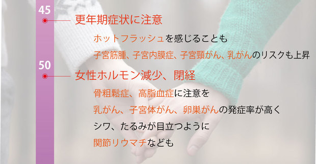 多くの人が閉経を迎える時期です。ここから先の年代は、女性ホルモンが減少していき、骨粗鬆症や高脂血症などになりやすいため注意が必要です。