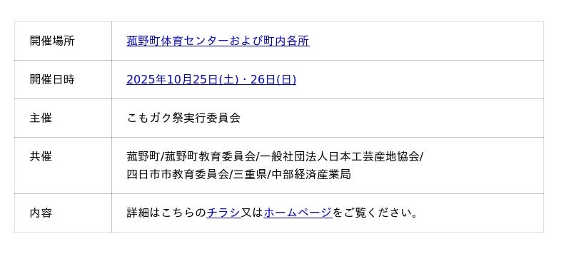 今年で10回目の「こもガク祭」。こもガク実行委員会は、2025年10月25日(土)・26日(日)に菰野町体育センターおよび町内各所で開催します。地元の魅力に触れられる体験型イベントです。