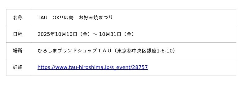ひろしまブランドショップTAUでは、お好み焼の日である10月10日(金)から10月31日(金)まで「TAU OK!!広島 お好み焼まつり」を開催します。