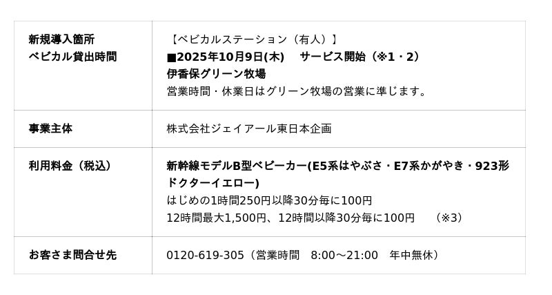 ○この度、10月9日より、群馬県渋川市のふれあい体験型牧場「伊香保グリーン牧場」でベビーカーのレンタルサービスを開始いたします。ベビーカーは、お子さまに大人気の新幹線モデルベビーカー(B型)を貸出いたします。