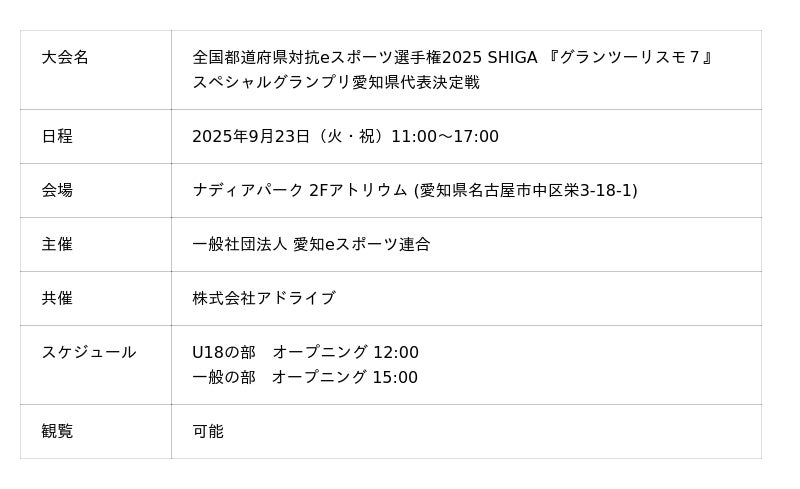一般社団法人 愛知eスポーツ連合(JeSU愛知、所在地:愛知県名古屋市、代表:片桐正大)は2025年9月23日(火・祝)、全国都道府県対抗eスポーツ選手権2025 SHIGA 『グランツーリスモ7』スペシャルグランプリ 愛知県代表決定戦をナディアパーク 2Fアトリウム (愛知県名古屋市中区栄3-18-1)にて開催しました。