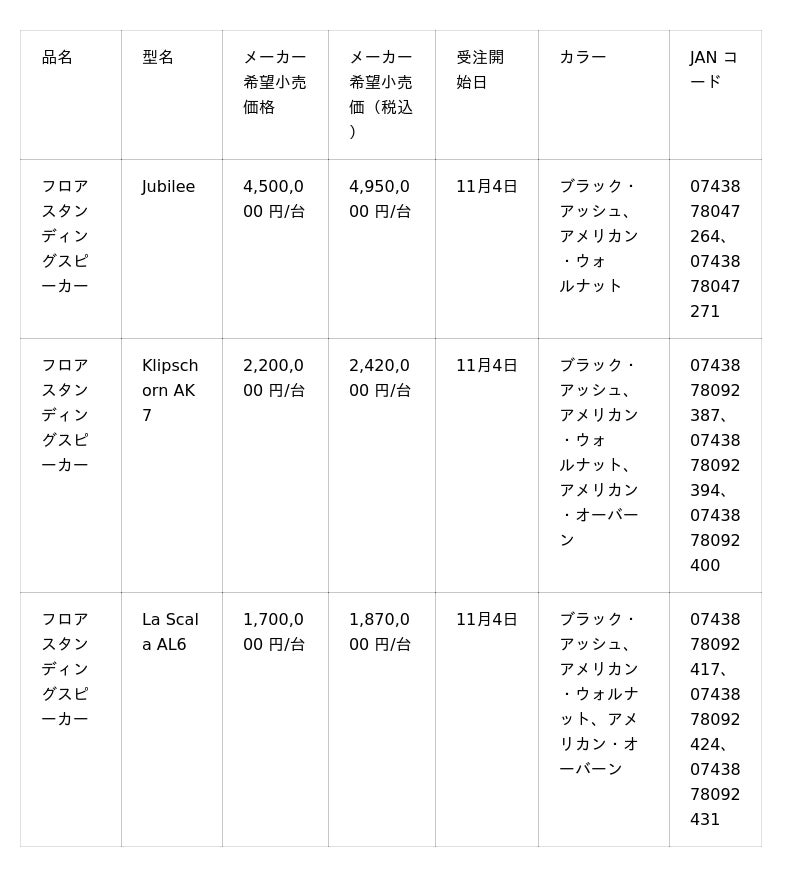 Klipsch(クリプシュ)は、Heritage シリーズスピーカー新製品、『Jubilee』、『Klipschorn AK7』および『La Scala AL6』を11月4日より受注開始いたします。