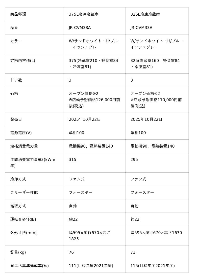 375L冷凍冷蔵庫(JR-CVM38A)・325L冷凍冷蔵庫(JR-CVM33A)の概要は以下の通りです。