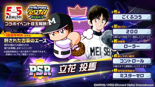 期間中にログインするだけで「[PSR]立花 投馬」がもらえる「あだち充画業55周年×栄冠クロス コラボ記念ログインキャンペーン」を実施するほか、「あだち充原作 MIX」とコラボした「激突!明青学園」や「あだち充原作 H2」とコラボした「探索!栄冠チーム」など、コラボを記念したさまざまなキャンペーンやイベントを開催します。