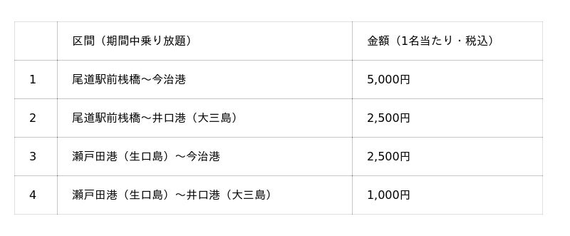 運賃は連続2日間乗り放題の「しまなみクルージングパス」を販売しており、尾道~今治間は5,000円(自転車積込料込み)とお得。島々を巡る日帰り観光でも、島内に宿泊するプランでも、しまなみ旅に最適です。