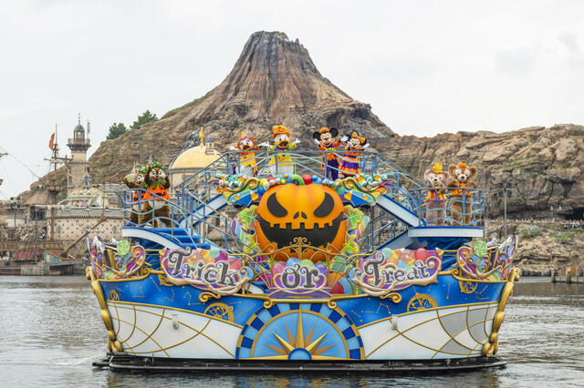ミッキーたちが、たくさんのお菓子と大きなパンプキンをのせたお船で登場。