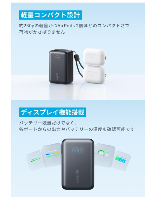 バッテリー残量に加え、各ポートからの出力や本体の温度もリアルタイムで確認できるディスプレイを搭載しています。