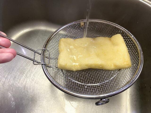 ざるをシンクに置いて熱湯をかければ、余分な油がすっと落ちてくれます。