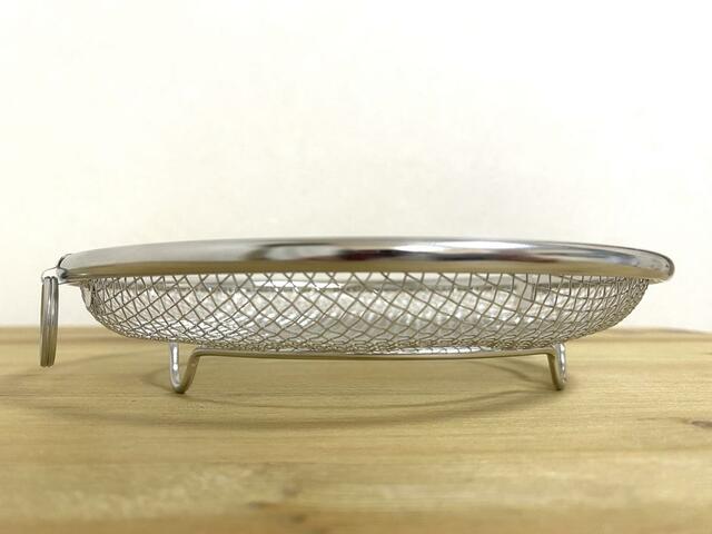 「すっきり暮らす盆ざる」は、フライパンにすっぽり収まるステンレス製の脚付きのざるです。