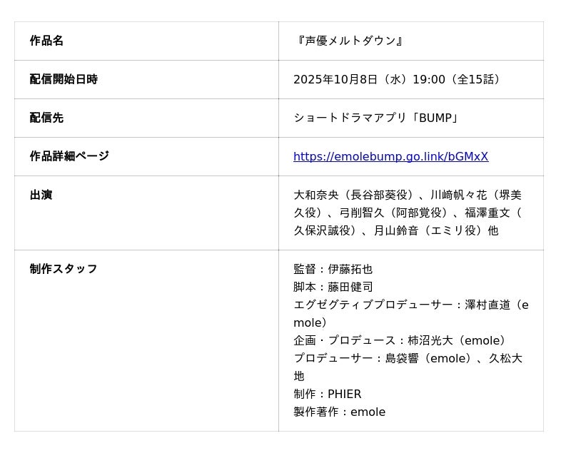 ショートドラマアプリ「BUMP」を運営する emole 株式会社(本社:東京都目黒区、代表取締役:澤村直道、以下 emole)は、BUMP オリジナルショートドラマ『声優メルトダウン』を2025年10月8日(水)19:00 より BUMP 独占配信いたします。