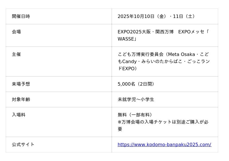 ※「未来のトビラをひらく『こども万博』」は株式会社Meta Osaka(こどもCandy)、株式会社ママそら(みらいのたからばこ)、株式会社キッズスター(ごっこらんどEXPO)の3社による共創プロジェクトとして開催。