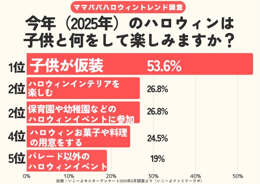 楽しみたい内容として最も多かったのは「子供が仮装をする」で53.6%。続いて「ハロウィン関連グッズを飾ってインテリアとして楽しむ」「保育園や幼稚園のイベント参加」(ともに26.8%)、「お菓子や料理の準備」(24.5%)が上位に入りました。