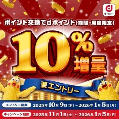 株式会社NTTドコモ(以下、ドコモ)は、対象のポイント交換企業(※1)が提供するポイントをdポイントへ交換するともれなく10%増量になる「ポイント交換でdポイント10%増量キャンペーン」(以下、本キャンペーン)を、2025年11月1日(土)から2026年1月5日(月)までの期間で開催いたします。