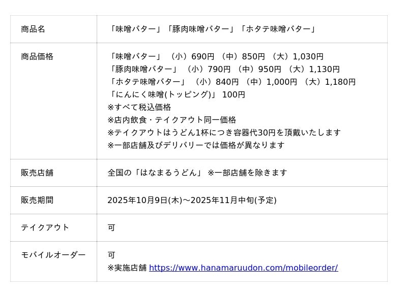 讃岐うどんチェーン「はなまるうどん」を展開する株式会社はなまる(本社:香川県高松市 代表取締役社長:前田良博、以下はなまる)は、2025年10月9日(木)より、全国(※一部店舗除く)のはなまるうどんにて、「味噌バター」「豚肉味噌バター」「ホタテ味噌バター」を期間限定販売いたします。