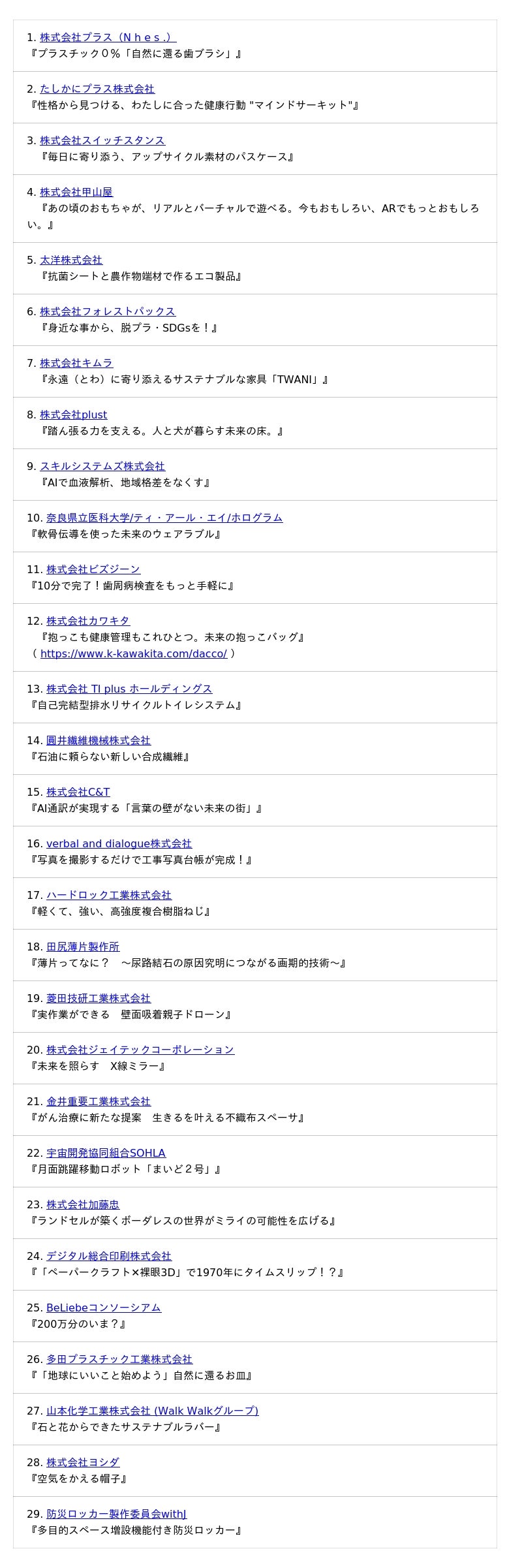 プラスチック0%の「自然に還る歯ブラシ」や、軟骨伝導を使った未来のウェアラブル、石油に頼らない新しい合成繊維など、全30社の製品・技術が一堂に会します。