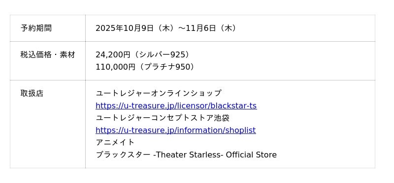 株式会社ユートレジャー(本社:東京都新宿区、代表取締役社長:青木 興一、株式会社ケイ・ウノの連結子会社)は、ワルメン応援&リズムゲーム『ブラックスター -Theater Starless-』(略称:ブラスタ)とのコラボレーションアイテム「カラーストーンリング(指輪)」を発売します。2025年10月9日(木)~11月6日(木)の期間、ユートレジャーオンラインショップ、ユートレジャーコンセプトストア池袋にて予約受付を行います。