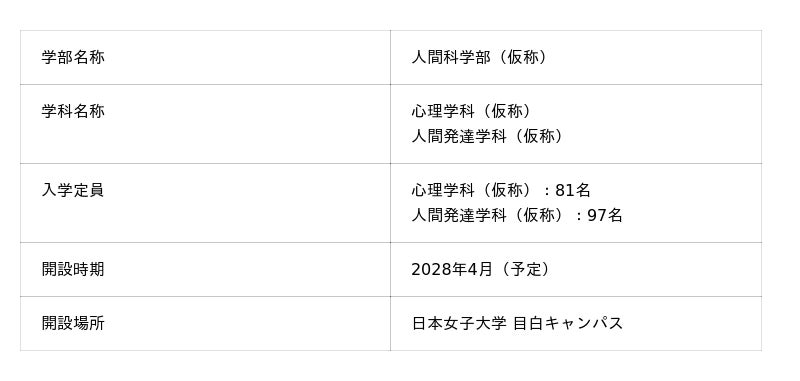 日本女子大学(東京都文京区、学長:篠原聡子)は、2028年4月に「人間科学部(仮称)」の開設を予定(構想中)し、準備を進めてまいります。