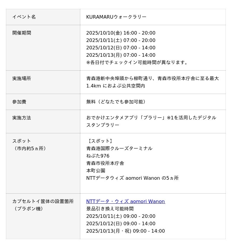「テクノロジーとエンターテインメントの力で人の心を動かし、すべての場所に人が集まる理由をつくり、地域の未来を明るくする」をパーパスに掲げるジオフラ株式会社(本社:東京都千代田区、代表取締役社長 社長執行役員CEO:尾崎雄一、以下ジオフラ)は、⻘森地域資源活用プロモーション実行委員会が開催する「青森港 暮らしのマルシェ」の企画の一つとして、「KURAMARUウォークラリー」を実施します。本ウォークラリーの参加者は、期間中にスポットを訪れてデジタルスタンプを集めることで、青森の美味しくて可愛いものを集めたご当地アクリルキーホルダーや、青森市観光大使アイドル、GMUの限定アクリルキーホルダーなど、ここでしか手に入らないオリジナル景品を獲得できます。