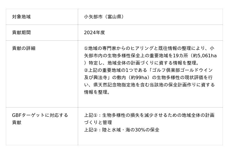 本貢献証書は、ネイチャーポジティブの実現に向けて生物多様性の保全や再生に力を入れる当社の取り組みが、世界目標(昆明・モントリオール生物多様性枠組、以下、GBF)にどれくらい貢献しているかを最新の科学的知見を活かし定量的に検証しており、専門家や研究機関によって客観的に評価されたことになります。