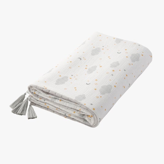 オリジナルブランドD by DADWAYのテキスタイル、「ドリーミングスター」を使用したガーゼケット。「きらきらと輝く星空のなか、たのしい夢がたくさん見られますように」という願いを込めてデザインしました。天然素材コットン100%で通気性、肌ざわりがよく、オールシーズンお使いいただけます。きらりと輝くラメプリントがアクセントです。
