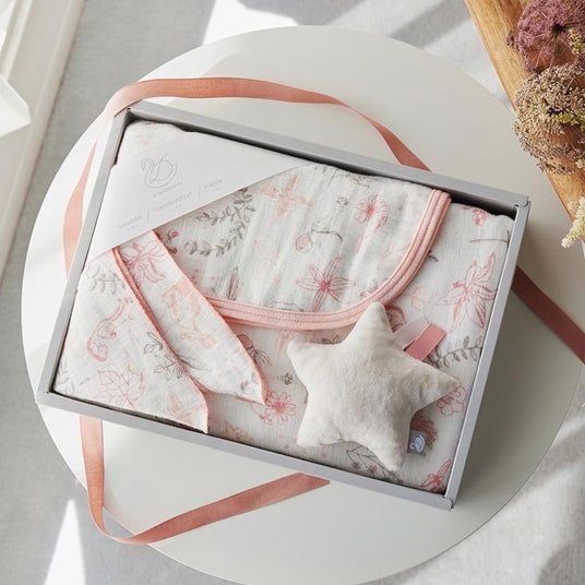 ブランドを代表する国産ガーゼシリーズ。ガーゼおくるみ、ガーゼハンカチとラトルが入ったBOX入りギフトセットです。ふんわりやわらかな肌ざわりが魅力で、おくるみとスタイに施された縁取りにより、使いはじめたときのハリ感が続きます。