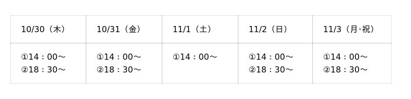 期間中は毎日2回開催(11/1は1回のみ開催)。