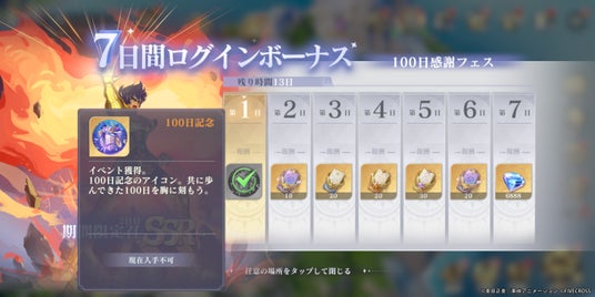 イベント期間中、毎日ログインするだけで様々な報酬を受け取れます!合計7日間ログインすることで「100日記念アイコン」「各種召喚チケット合計100枚」「ブルーダイヤ×6888」を無料でもらえます!ぜひお見逃しなく!