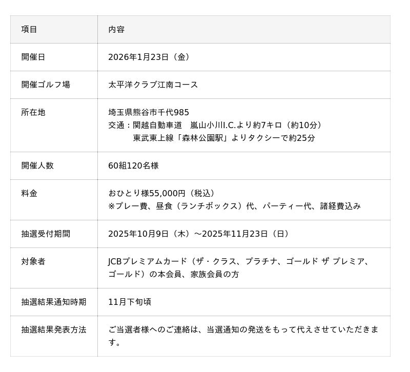 株式会社ジェーシービー (本社:東京都港区、代表取締役会長兼執行役員社長:二重 孝好、以下:JCB)は、JCBプレミアムカード会員様向けイベントとして「JCB Premium Golf 2026」を2026年1月23日(金)に開催いたします。